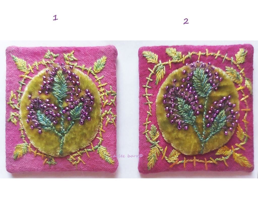 I LOVE these juicy little pieces! I explore colour, stitch, embellishments and texture on a jewel scaled piece. 2.5" sq is a lovely size to slip into a card, or with a mug containing a hot chocolate/coffee mix, and won't break the bank!